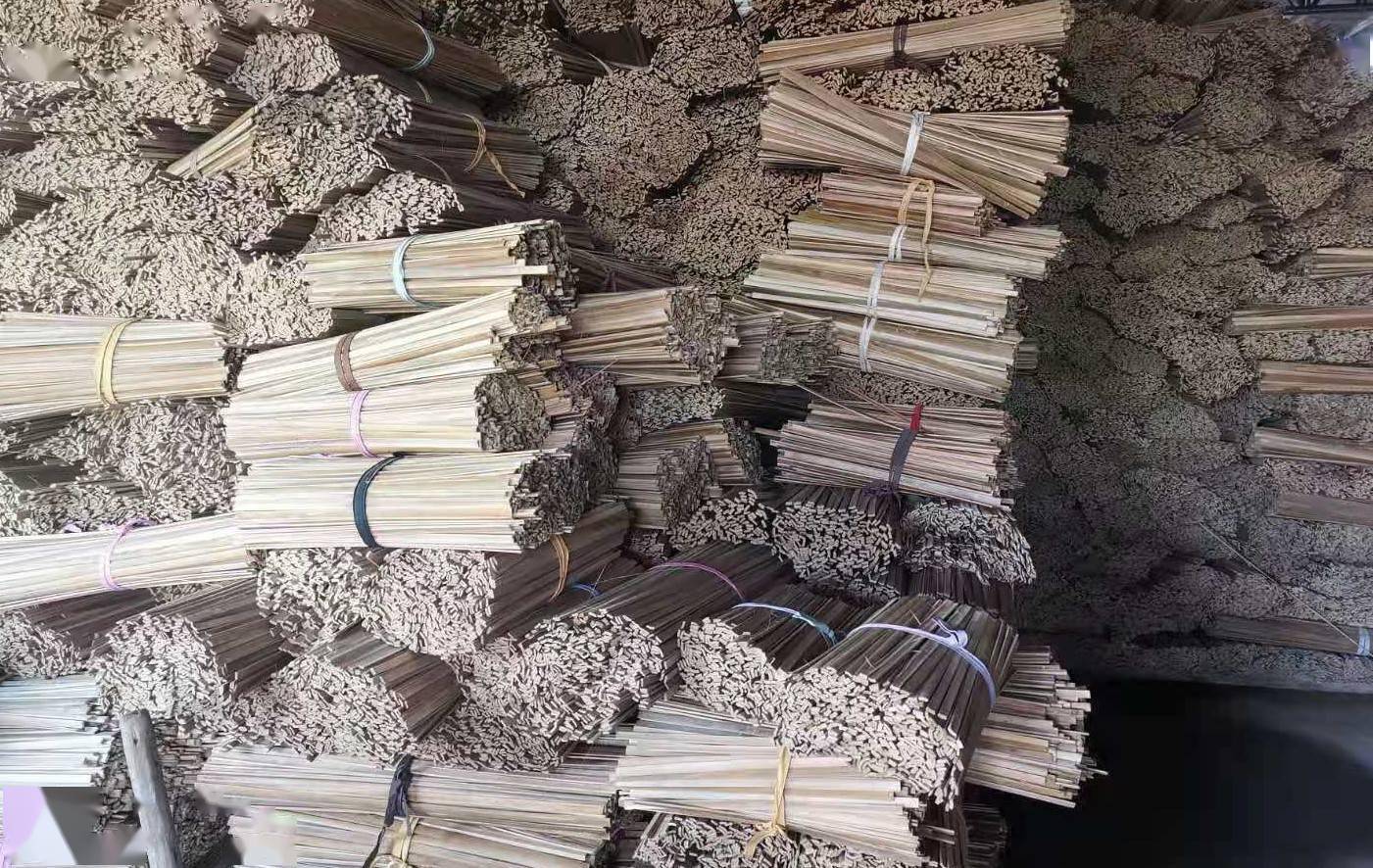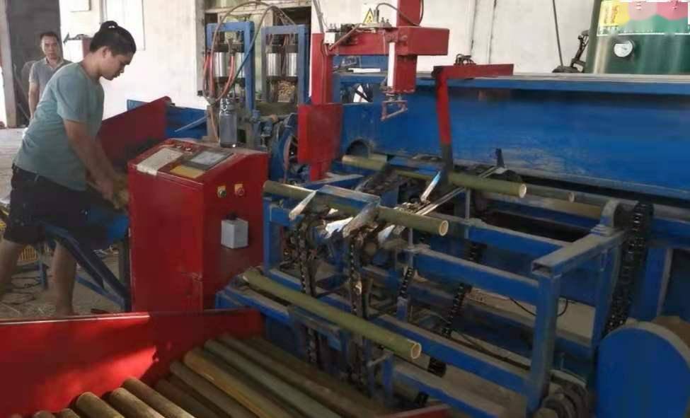 一根普普通通的竹子到底是如何变成餐签的?记者在其位于禾仓村的帮扶厂房看到,新鲜的竹子经竹筒长短分拣机,按需切割成长度不等的竹筒,然后由分片机快速剖成两厘米左右的竹片(日晒两天后),送入烘干设备彻底脱水,再上到拉丝机一拉便“吐出”大小均匀的小竹棒,最后磨光削尖即成。
