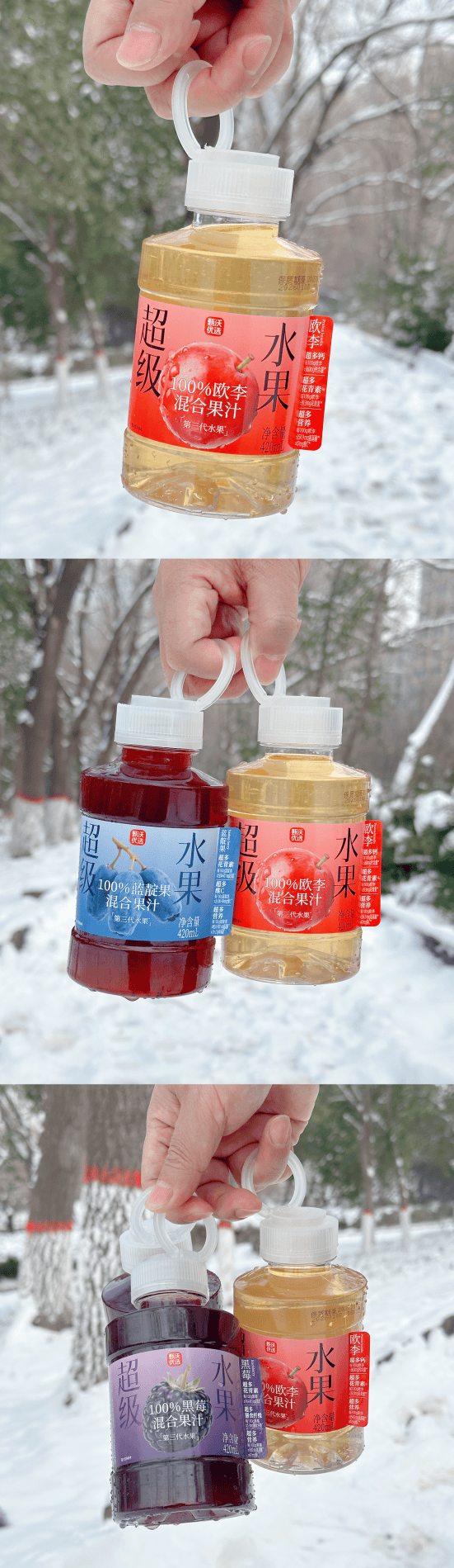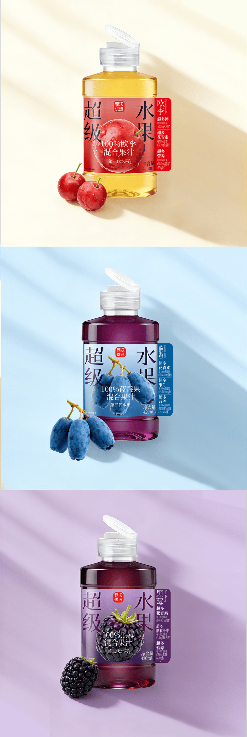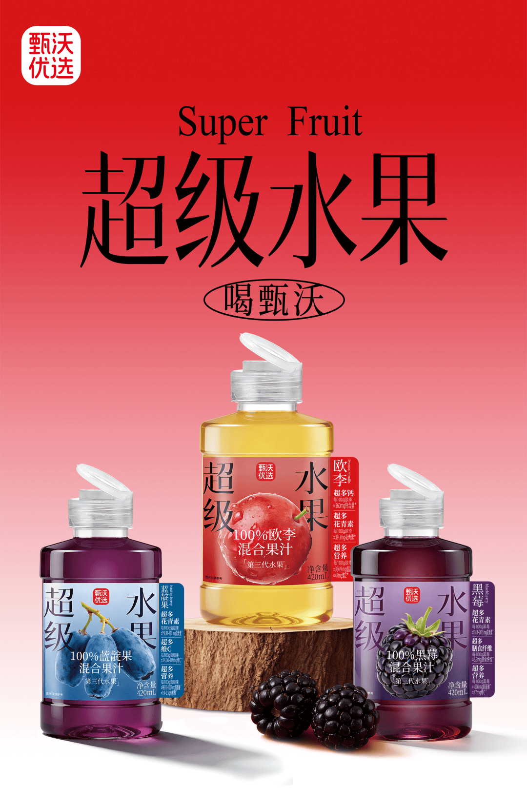 反观甄沃优选,其创新之处远不止于原料。品牌敏锐捕捉到年轻群体对“颜值经济”和“便携体验”的双重需求,率先引入一线新茶饮流行的“吨吨桶”瓶型。这种设计不仅容量适中、握感舒适,更自带话题属性——瓶身线条流畅、色彩明快,搭配欧李的绯红、蓝靛果的深紫、黑莓的墨黑,形成强烈的视觉记忆点。
