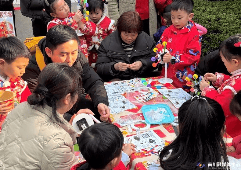 手工集市区域同样人气爆棚,亲子协作的身影随处可见。废旧瓶盖串成精致的新年挂饰,闲置光碟拼成创意十足的时钟,旧纸张剪裁出喜庆的窗花,原本即将被丢弃的“废品”,在家长与孩子的巧手下焕发新生,变成了寓意美好的新春物件。动手过程中,孩子们不仅体验到创作的乐趣,更深刻理解了“资源再生”的意义,环保理念在实践中悄然扎根。