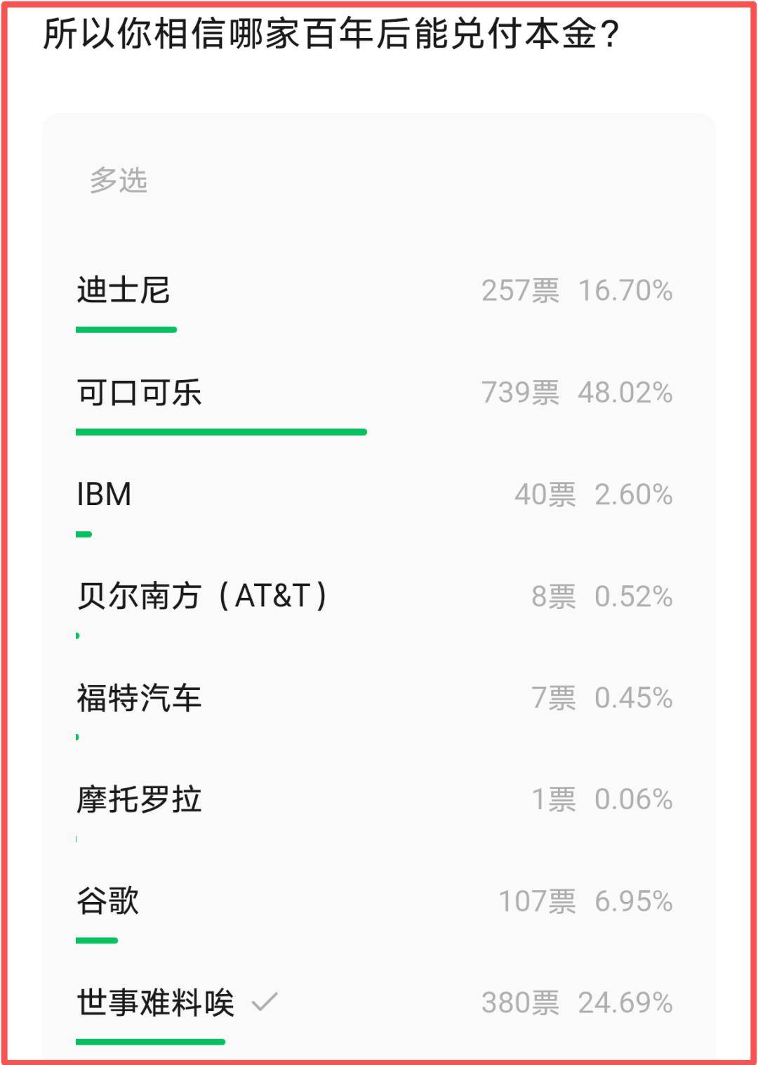 昨天文末的,可口可乐压倒性优势拿下第一,摩托罗拉差点被剃光头。看来大家觉得简单成瘾的消费品更有护城河,而硬科技变数多,容易被颠覆。